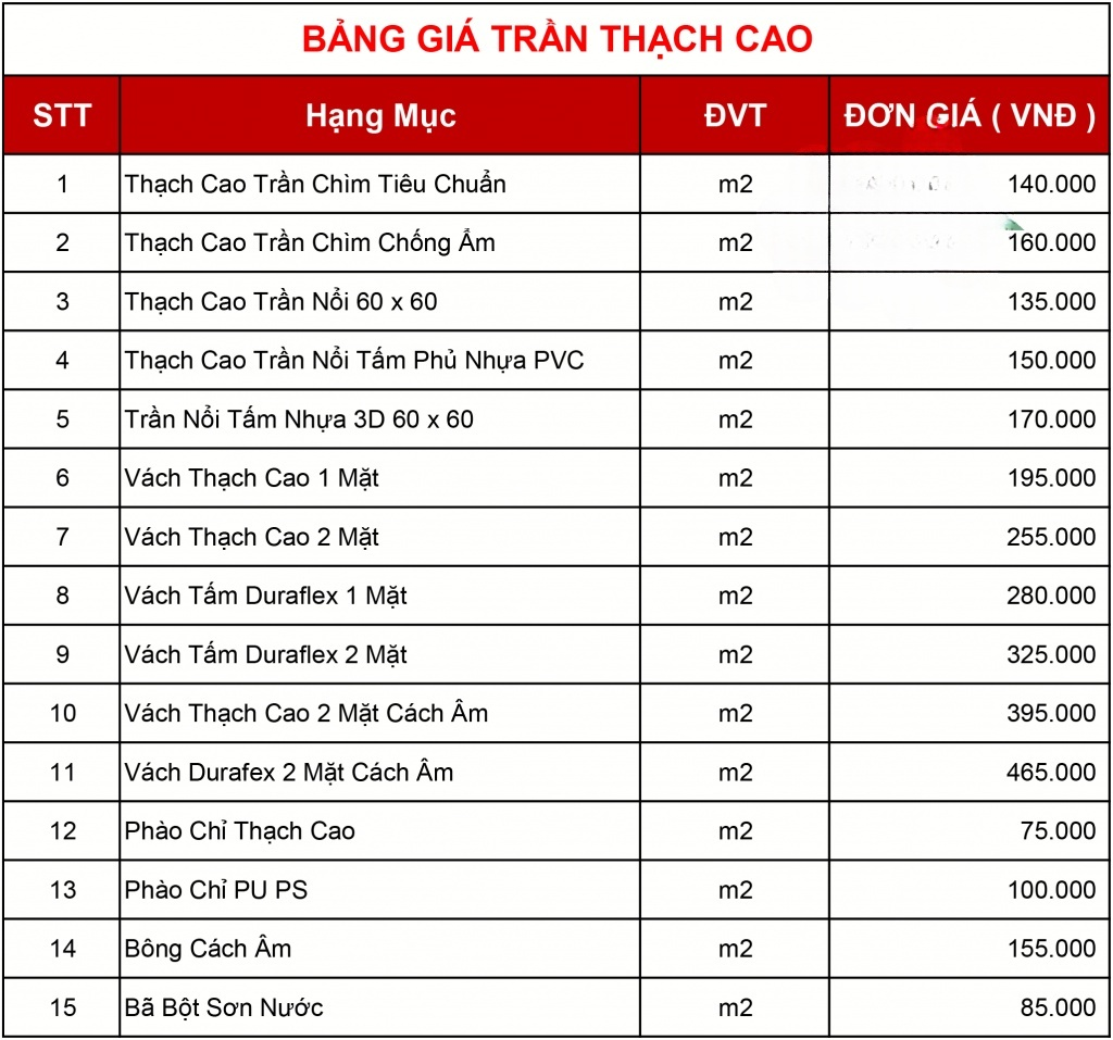 BẢNG GIÁ THI CÔNG TRẦN THẠCH CAO